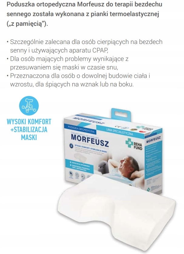 Poduszka ortopedyczna Morfeusz do terapii bezdechu sennego, która przeciwdziała przesuwaniu się maski. Daje poczucie wysokiego komfortu oraz stabilizuje pozycję głowy w trakcie snu.