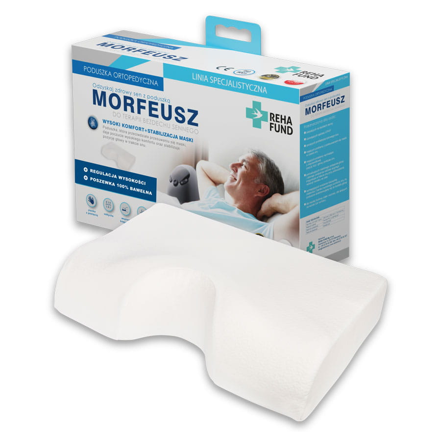 Poduszka Morfeusz jest wykonana z pianki termoelastycznej („z pamięcią”), co zapewnia bardzo wysoki komfort leżenia i wrażenie niezwykłej miękkości. Dodatkowe rowki poprzeczne zapewniają bardzo dobrą cyrkulację powietrza i zmniejszają potliwość skóry. Poduszka Morfeusz do terapii bezdechu sennego posiada regulację wysokości – wystarczy wyjąć jedną warstwę pianki jeśli jest za wysoka, co pozwala na dopasowanie jej do budowy ciała właściciela. Jest dostosowana do spania na plecach i na boku.