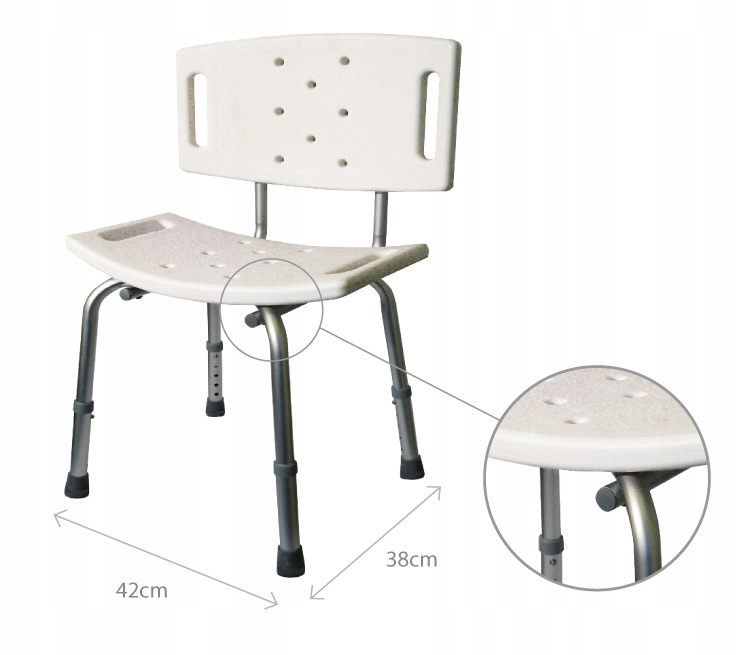 Dzięki regulowanej wysokości nóg (36–47 cm), krzesło można dostosować do indywidualnych potrzeb użytkownika. Antypoślizgowe, gumowe nasadki stabilizują pozycję krzesła i chronią powierzchnię kabiny lub brodzika. Co więcej, boczne uchwyty w siedzisku ułatwiają przenoszenie oraz dodatkowo wspierają użytkownika przy siadaniu i wstawaniu. Produkt łatwy w montażu, bez użycia narzędzi.