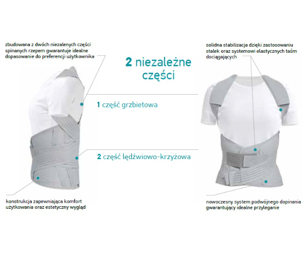 Dzięki takiej konstrukcji pas równomiernie rozkłada nacisk na plecy. W rezultacie zmniejsza obciążenie mięśni oraz ogranicza ryzyko przeciążeń kręgosłupa.