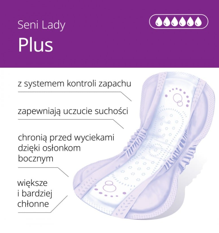 Produkt charakteryzuje się najwyższą chłonnością w linii Seni Lady – 6/6 kropli. Dzięki temu sprawdza się przy częstszych i bardziej intensywnych wyciekach moczu. Co więcej, wkład chłonny z superabsorbentem szybko wchłania wilgoć i zatrzymuje ją wewnątrz, dlatego zapewnia uczucie suchości. W rezultacie użytkowniczka może uniknąć dyskomfortu oraz podrażnień skóry.