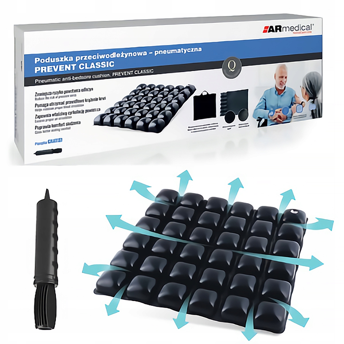 Poduszka przeciwodleżynowa pneumatyczna Prevent Classic AR-093 zmniejsza ucisk na kość ogonową i miednicę, poprawia wentylację oraz krążenie, a regulowana twardość pozwala dostosować komfort. Pokrowiec siatkowy Mesh i uchwyt ułatwiają codzienne użytkowanie zarówno w domu, jak i na wózku inwalidzkim.