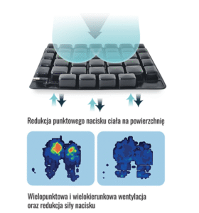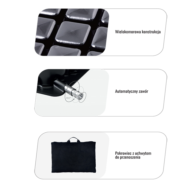 • System wielokomorowy / balans ciała: komory łączą się w jeden system powietrzny, co pozwala na automatyczne wyrównywanie nacisku.