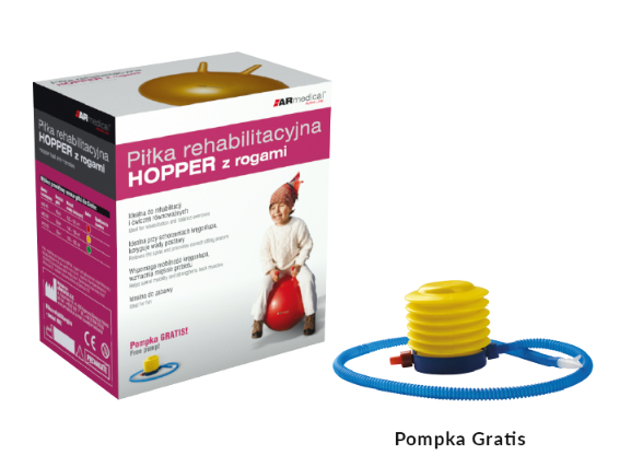 Piłka rehabilitacyjna Hopper z rogami to wyrób medyczny przeznaczony do ćwiczeń ogólnorozwojowych, rehabilitacji oraz aktywizacji ruchowej, szczególnie u dzieci. Produkt wspiera rozwój równowagi oraz koordynacji, dlatego angażuje mięśnie całego ciała i jednocześnie poprawia stabilizację. Dzięki temu użytkownik może skutecznie wzmacniać mięśnie oraz poprawiać sprawność fizyczną.