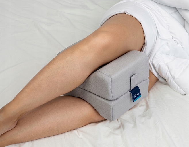 Ortopedyczny klin między kolana Timago wykonany z pianki memory foam. Wymiary ok. 24 × 21 × 13 cm, zdejmowany pokrowiec z zamkiem. Pomaga utrzymać prawidłowe ułożenie bioder, kolan i kręgosłupa podczas snu. Idealny dla osób śpiących na boku i kobiet w ciąży.
