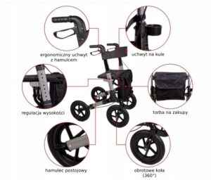 Co więcej , model oferujący aż sześciostopniową wysokość (85–103 cm), więc można go zastosować do wzrostu użytkownika, co wpływa na ergonomię i pozycję. Ponieważ chodzik jest składany, można go szybko zapakować do bagażnika lub schowki – doskonały na wypady lub spacer. Dodatkowe, przednie koła są boczne, następnie tylne hamulce z zablokowanym, co zapewnia bezpieczeństwo podczas postoju i odpoczynku.