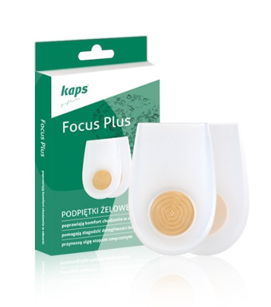 Podpiętki żelowe Focus Plus Kaps to wyrób medyczny przeznaczony dla osób odczuwających ból pięt, przeciążenia stóp lub dyskomfort podczas chodzenia. Produkt unosi tylną część stopy, ponieważ posiada specjalną konstrukcję żelowo-silikonową, a jednocześnie zmniejsza nacisk na piętę. Dzięki temu poprawia komfort chodzenia oraz ogranicza dolegliwości bólowe.