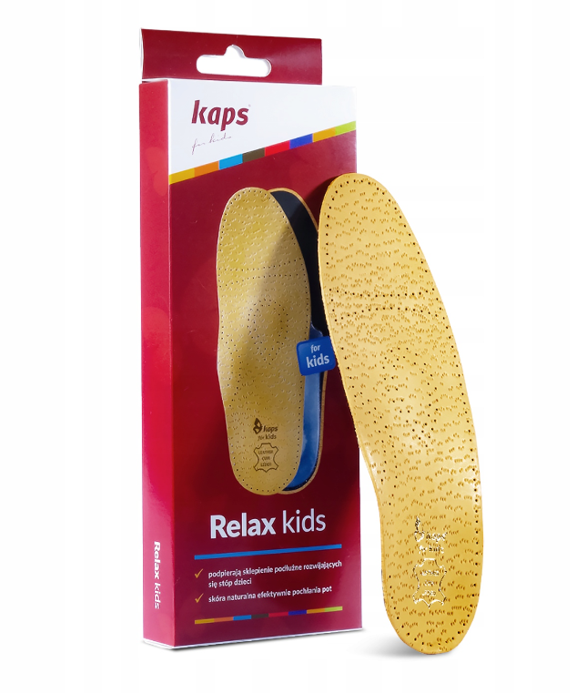 Wkładki ortopedyczne dziecięce Kaps Relax Kids to wyrób medyczny przeznaczony dla dzieci z problemami stóp, takimi jak płaskostopie podłużne czy koślawość pięt. Produkt wspiera prawidłowe ustawienie stopy, ponieważ posiada profilowaną konstrukcję, a jednocześnie zmniejsza przeciążenia podczas chodzenia.